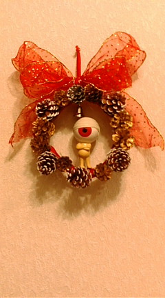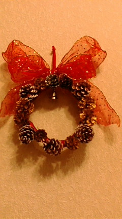 リースは100均の枝に、ツリー用のまつぼっくりを付けただけ、