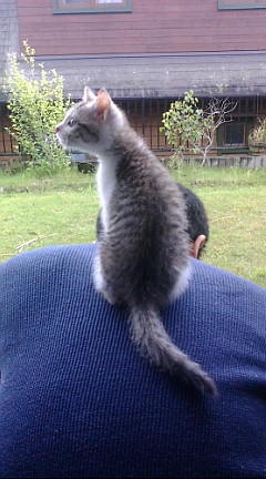 爪を切ってる夫の背中に飛び乗ったハチ。 横顔がなんとも可愛くて載せたかったんだけど、 本館じゃちょっと恥ずかしいのでこちらに。 一息で背中まで飛び乗れるようになったのも嬉しい。 ハチは室内飼いなので、外には出さないんだけど、 本猫もあんまり外には行きたがらない。 この庭の隅でみゅーみゅー泣いてたから、 トラウマになってるんだろうって友人は言うけど、 本当にそうなのかも? しかし、大きくなったなぁ。 4泊5日ぶりに帰ってきた夫が、 ハチが重いといってびっくりしてた。 毎日毎日、目に見えて成長してるのね。
