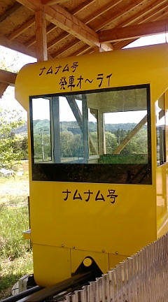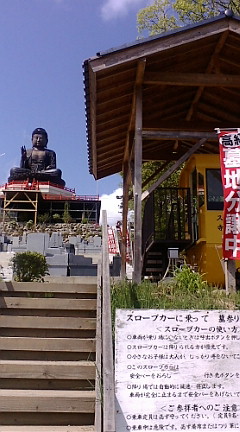 これがナムナム号だ(笑)! 全体像はこんな感じ。 距離は短い斜面なんだけど、車で登れないので、 お墓参りのお年寄りにはありがたいであろう存在。 ここは児童館の散歩コースにもなっていて、 行くとお菓子をもらえたりする。 小正月の頃には、大仏様の台に提灯が飾られていたりもする。 イルミネーションみたいでおもしろい。 ・・冬になると、サンタのコスプレをさせたくなるのは私だけかなぁ。 似合うと思うんだ、この大仏さん。